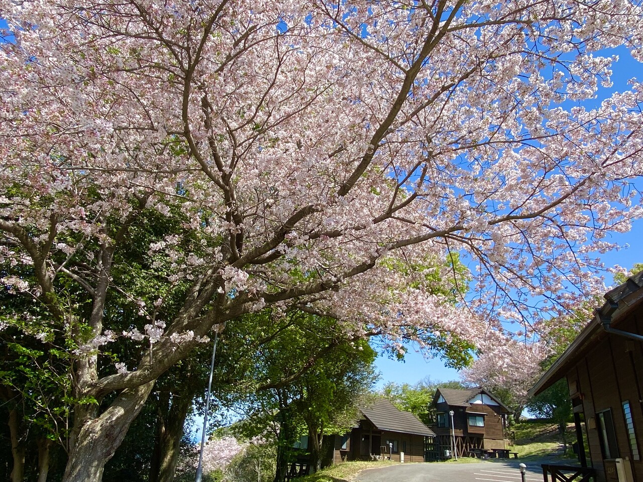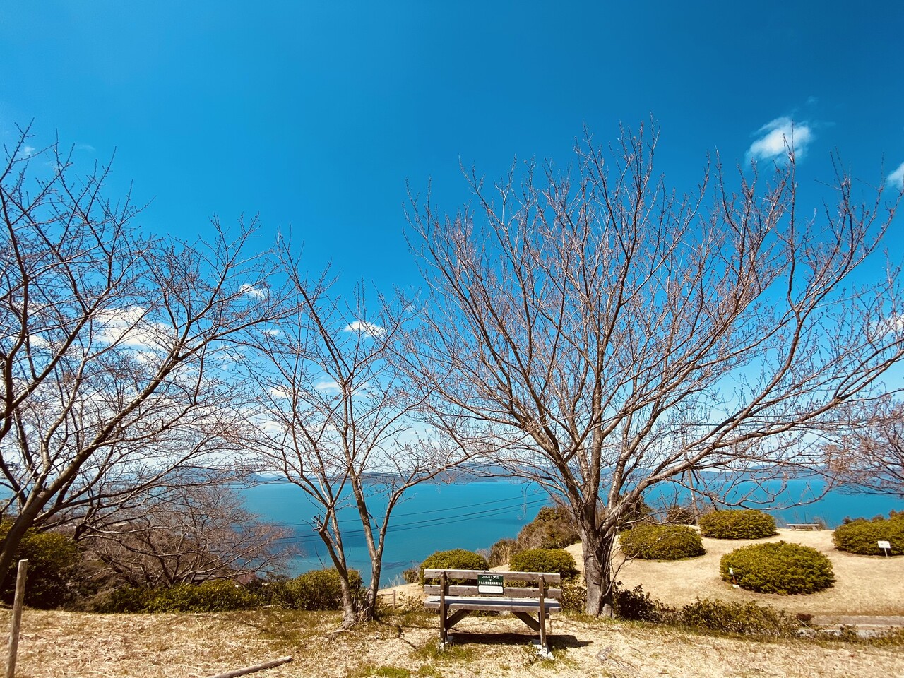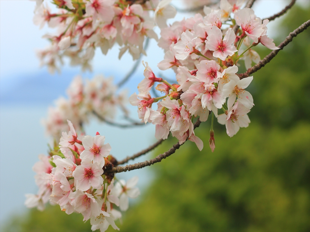 周辺の山桜は満開で、清楚な白花が海や空の青に映えます。